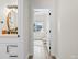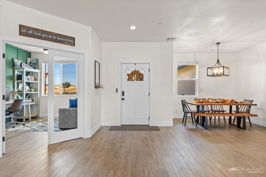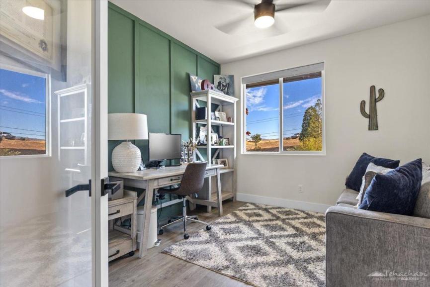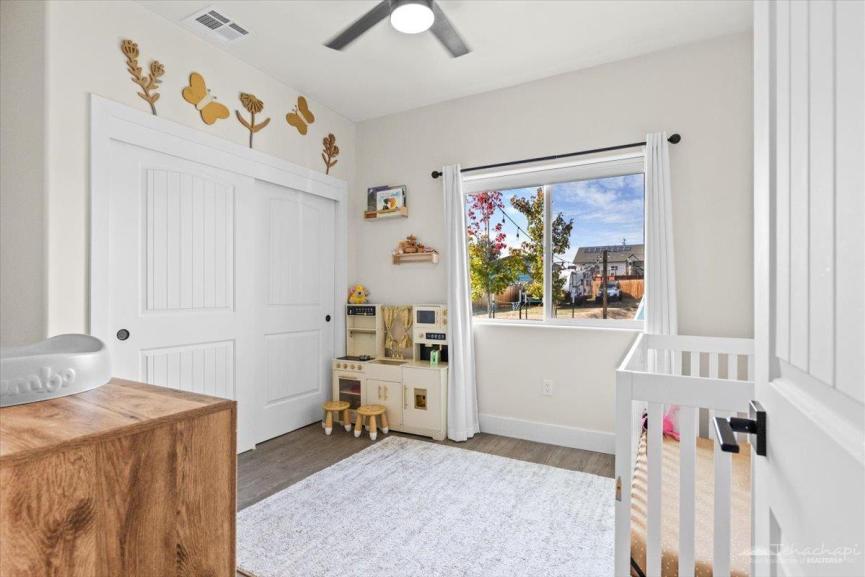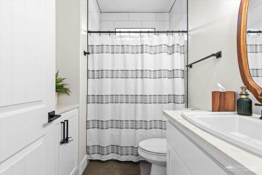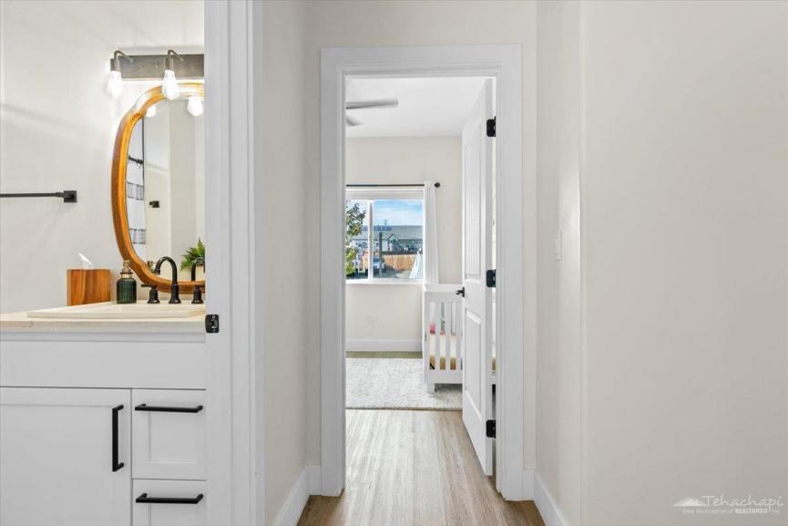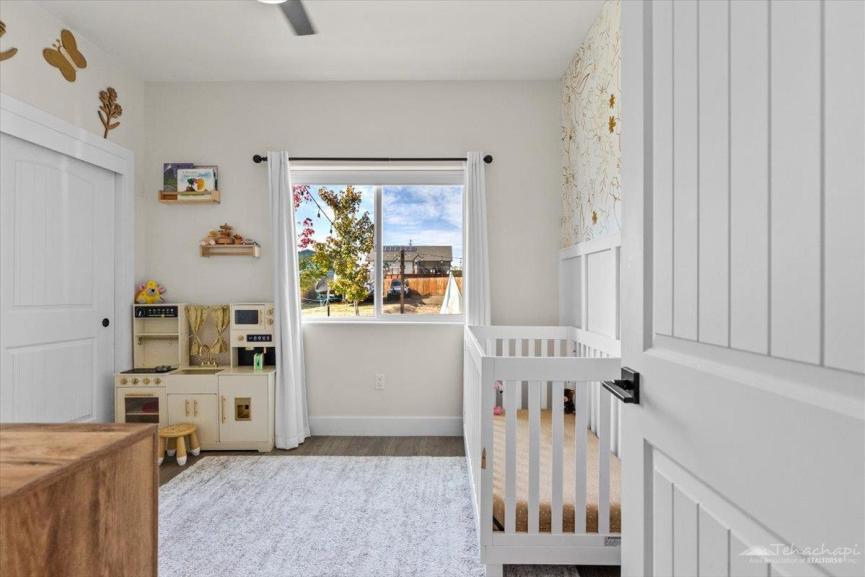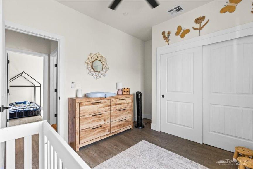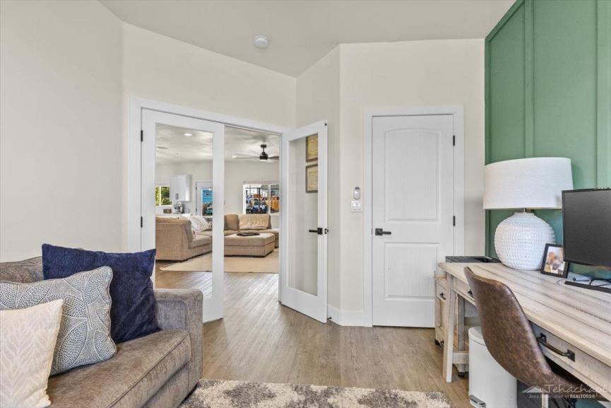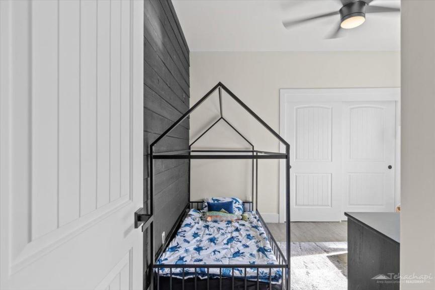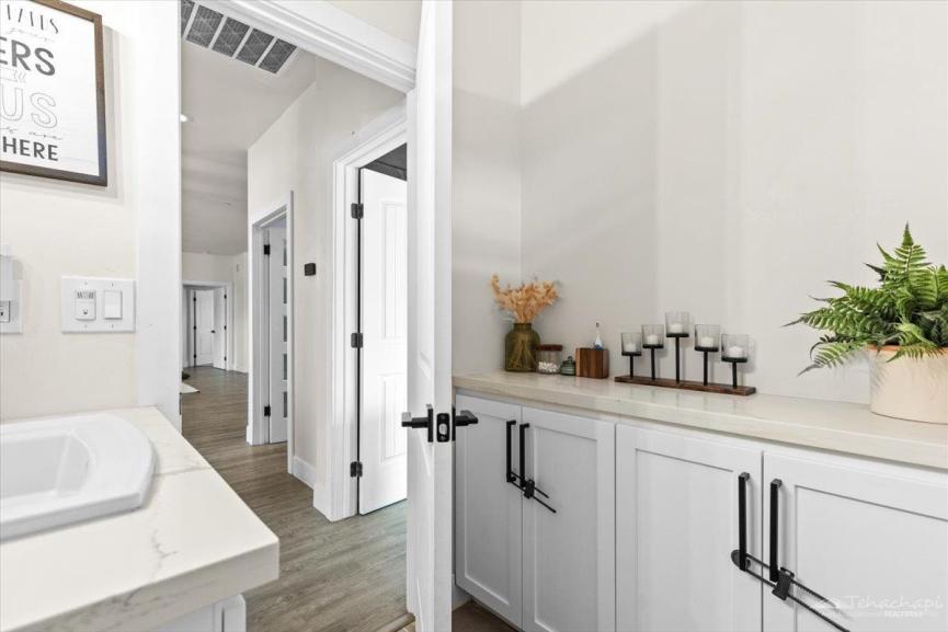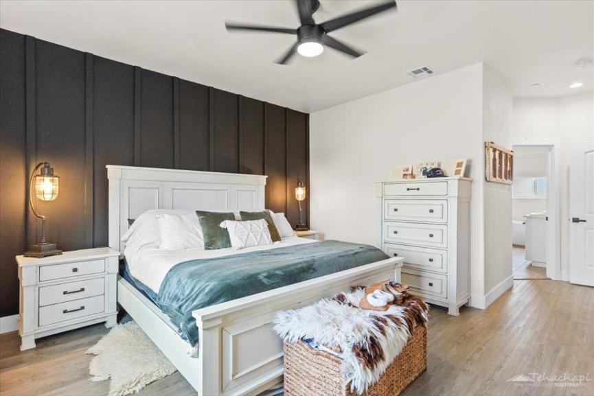 Thoughtful custom touches can be found throughout the home, including vinyl wood plank flooring, oversized baseboards, an accent wall in each bedroom, and two-panel beadboard doors.