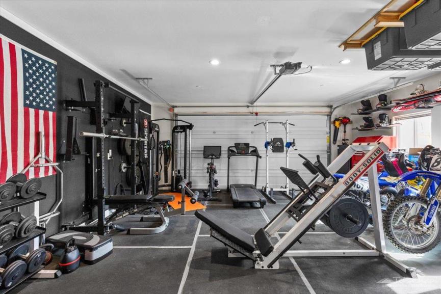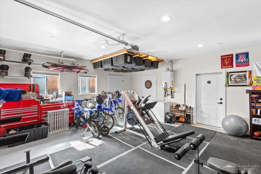 The garage is fully equipped with a storage closet, mounted shelving, an exterior RV plug, and a walk-in Tuff Shed. Plus, enjoy peace of mind with a Ring doorbell and five security cameras already installed.