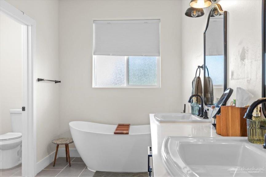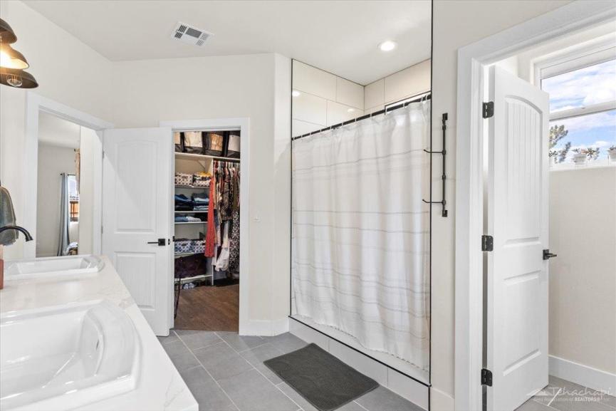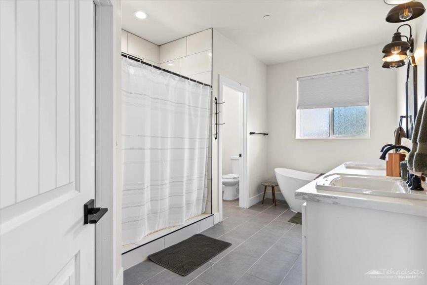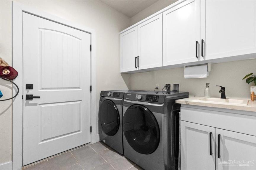The primary suite is a private retreat with a walk-in shower, double vanity, and a luxurious free-standing soaking tub. The laundry room offers a sink and ample cabinetry, keeping your home functional and organized.