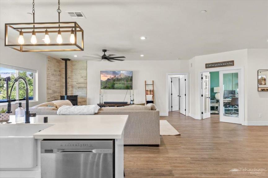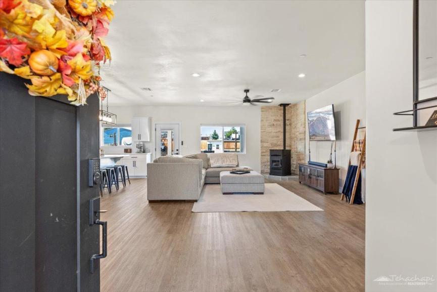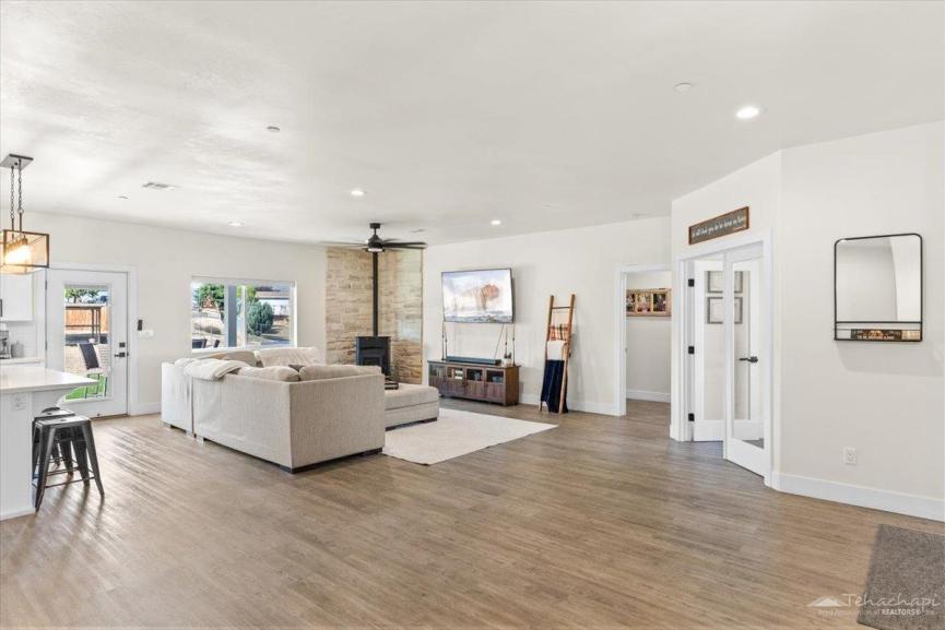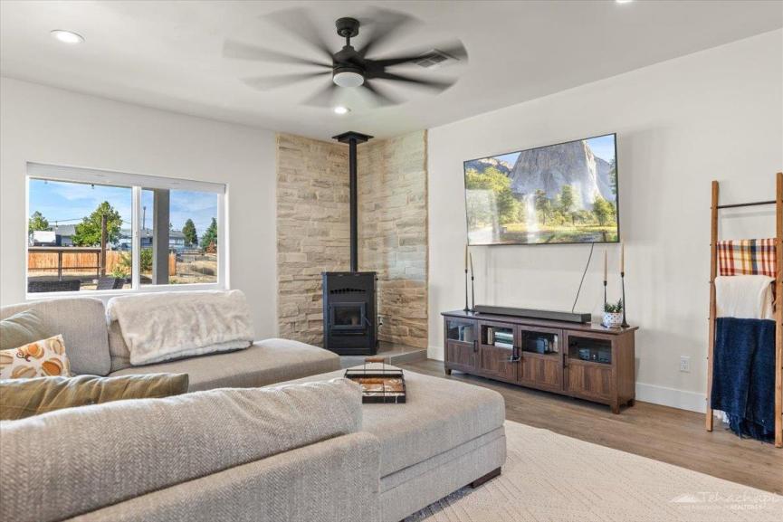 The inviting family room features a pellet stove with a beautiful stone surround perfect for cozy winter evenings.
