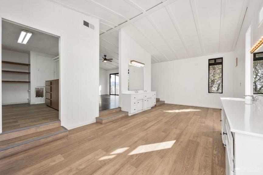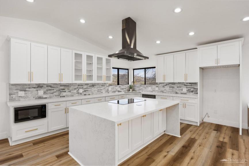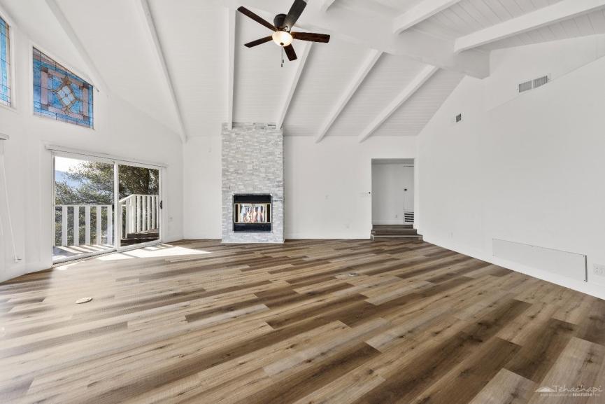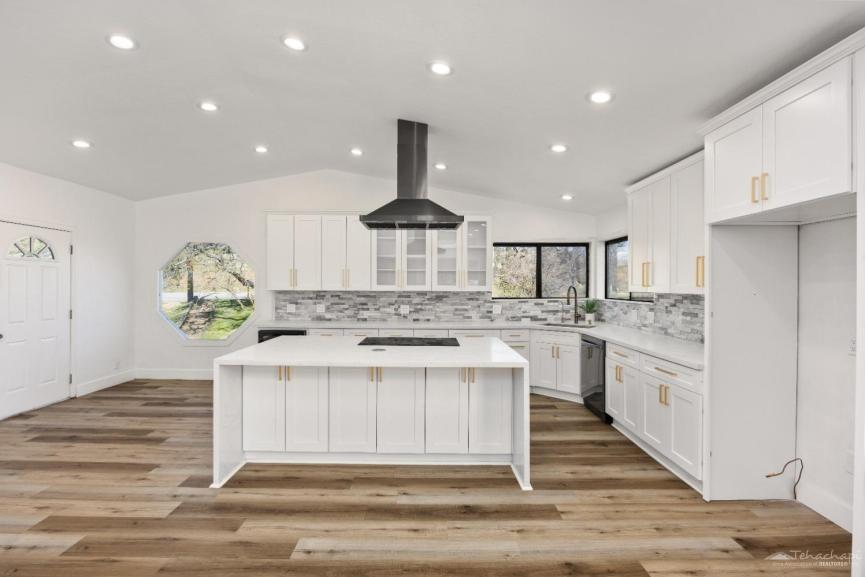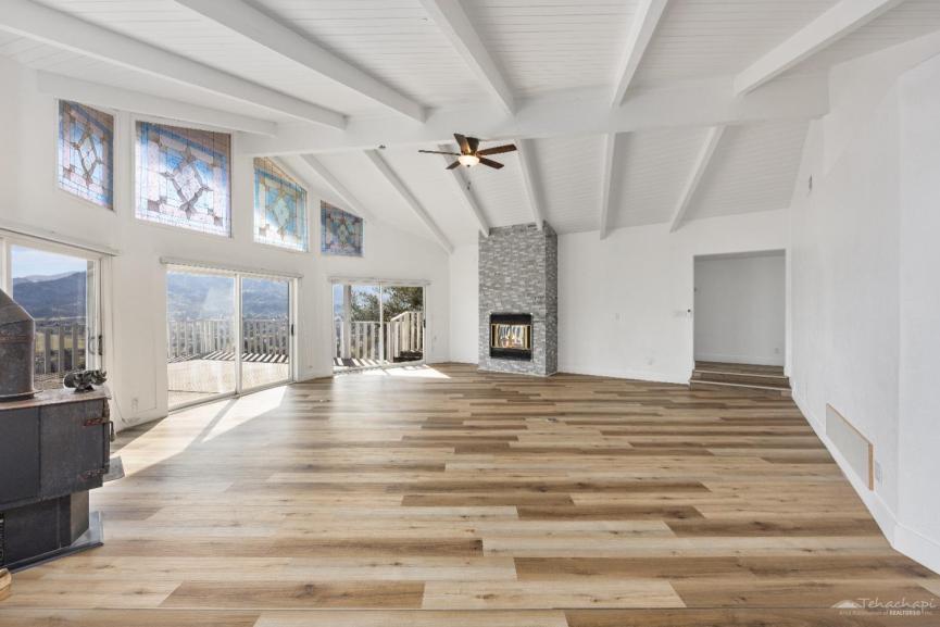 Step inside to a completely remodeled dream kitchen, featuring brand-new cabinets, quartz countertops, and a stylish backsplash. The cascade-edge island is perfect for gatherings, while the huge walk-in pantry includes a convenient coffee bar just outside for your morning brew. The expansive living room boasts two cozy fireplaces, creating a warm and inviting space to unwind during Tehachapi's picturesque snowy winters. Floor-to-ceiling windows and sliding doors open onto a brand-new deck, where panoramic views of Cummings Valley and the charming town of Stallion Springs stretch out before you.